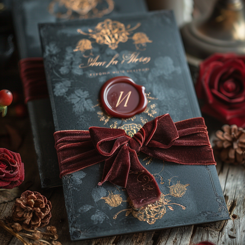 Setup: Red velvet tablecloth, gold cutlery, dark roses, warm candles.